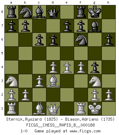 Last move : 1-0 2011 November 25 2:1:6 [Event "FICGS__CHESS__RAPID_B__000188"] [Site "FICGS"] [Date "2011.10.10"] [Round "1"] [White "Sternik,Ryszard"] [Black "Biason,Adriano"] [Result "1-0"] [WhiteElo "1825"] [BlackElo "1735"] 1.e4 g5 2.d4 h6 3.Bd3 Bg7 4.Ne2 d6 5.O-O c6 6.c3 Nf6 7.Na3 O-O 8.f4 g4 9.Ng3 1-0 This chess game has been lost on time (started : 2011.10.10 21:5:22) Reversed Grob (Borg/Basman defense/macho Grob) Kingside Castling by player White (move 5) Kingside Castling by player Black (move 7) Player White won this chess game. Follow this game move after move (download)Chess is really ninety nine percent calculation. (Soltis) Habe Mut, dich deines eigenen Verstandes zu bedienen. (Immanuel Kant) Antes de los Finales, los dioses han colocado el Juego Medio. (Siegbert Tarrasch) Le moment que je préfère le plus dans une rencontre, c'est celui où je sens que la personnalité de l'adversaire se brise. (Robert Fischer) It's only after you lost everything, Tyler says, that you're free to do anything. (Chuck Palahniuk, Fight Club)