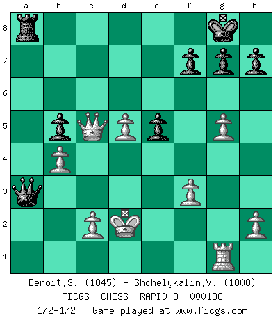 Last move : 1/2-1/2 2011 December 5 12:36:34 [Event "FICGS__CHESS__RAPID_B__000188"] [Site "FICGS"] [Date "2011.10.10"] [Round "1"] [White "Benoit,Sebastien"] [Black "Shchelykalin,Vyacheslav"] [Result "1/2-1/2"] [WhiteElo "1845"] [BlackElo "1800"] 1.e4 c5 2.Nf3 d6 3.d4 cxd4 4.Nxd4 Nf6 5.Nc3 a6 6.Be3 e5 7.Nb3 Be6 8.f3 Be7 9.Qd2 O-O 10.O-O-O Nbd7 11.g4 b5 12.g5 Nh5 13.Rg1 Nb6 14.Qf2 Nc4 15.Bxc4 bxc4 16.Nc5 Qc7 17.N5a4 Rab8 18.Nb6 Nf4 19.Nbd5 Nxd5 20.Nxd5 Bxd5 21.Rxd5 Rb7 22.Bd2 Rb5 23.Rxb5 axb5 24.Bb4 Ra8 25.Kb1 c3 26.bxc3 d5 27.exd5 Bxb4 28.cxb4 Qc4 29.Qc5 Qxa2+ 30.Kc1 Qa3+ 31.Kd2 1/2-1/2 Sicilian : Najdorf, Byrne (English) attack Kingside Castling by player Black (move 9) Queenside Castling by player White (move 10) This chess game ended in a draw. Follow this game move after move (download)Capture of the adverse King is the ultimate but not the first object of the game. (William Steinitz) Jede Eröffnung ist gut genug um gespielt zu werden, wenn nur ihr Ruf schlecht genug ist. (Savielly Grigorievitsch Tartakower) En el Ajedrez, cuando menos, el valiente hereda la tierra. (Edmar Mednis) Il a essayé de se convaincre qu'il pourrait empêcher toutes les erreurs et ne jamais perdre. L'horreur ! Gary Kasparov au sujet de Robert Fischer. Warrior pose battles inner weakness and wins focus. You see that there is no war within you. You're on your own side, and you are your own strength. (Terri Guillemets)
