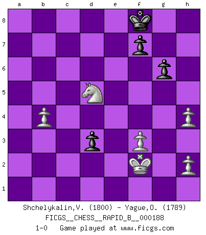 Last move : 1-0 2012 February 26 17:51:46 [Event "FICGS__CHESS__RAPID_B__000188"] [Site "FICGS"] [Date "2011.10.10"] [Round "1"] [White "Shchelykalin,Vyacheslav"] [Black "Yague,Omar"] [Result "1-0"] [WhiteElo "1800"] [BlackElo "1789"] 1.d4 Nf6 2.c4 e6 3.Nf3 b6 4.g3 Ba6 5.Qa4 c5 6.Bg2 Bb7 7.dxc5 Bxc5 8.O-O Bc6 9.Qd1 O-O 10.Nc3 d6 11.Bf4 e5 12.Bg5 Nbd7 13.a3 a5 14.Rb1 h6 15.Bxf6 Nxf6 16.b4 axb4 17.axb4 Bxf2+ 18.Rxf2 Ng4 19.Rf1 Ne3 20.Qd3 Nxf1 21.Rxf1 Qc7 22.Nh4 Bxg2 23.Kxg2 Ra3 24.Rf3 Rc8 25.Nf5 Qxc4 26.Ne7+ Kh8 27.Nxc8 Qxc8 28.Qd2 Qc6 29.Nd5 Rxf3 30.exf3 b5 31.Nc3 Kg8 32.Qd3 h5 33.Nxb5 d5 34.Nc3 d4 35.Ne4 Qa4 36.Qc4 h4 37.gxh4 g6 38.Nd6 Qd7 39.Qd5 e4 40.Nxe4 Qxd5 41.Nf6+ Kf8 42.Nxd5 d3 43.Kf2 1-0 Queen's Indian : Nimzovich variation (exaggerated Fianchetto) Kingside Castling by player White (move 8) Kingside Castling by player Black (move 9) 10 pieces endgame at move 42 : White KNPPPP , Black KPPP WHITE : King + 1 Knight 4 Pawns BLACK : King + 3 Pawns Player White won this chess game. Follow this game move after move (download)Your body has to be in top condition. Your Chess deteriorates as your body does. You can't separate body from mind. (Bobby Fischer) Es gibt keine einzige Frau, der ich nicht einen Springer vorgeben könnte und trotzdem gewänne. (Robert James Fischer) El Ajedrez es una hermosa aventura. (Bent Larsen) Les Cavaliers se révèlent fort utiles dans les positions fermées. D'habitude, les Fous sont un peu plus forts que les Cavaliers dans les positions ouvertes. Qu'on le veuille ou non, il restera toujours des exceptions ! Luck has a peculiar habit of favoring those who don't depend on it. (Author unknown)