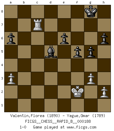 Last move : 1-0 2012 March 3 8:9:0 [Event "FICGS__CHESS__RAPID_B__000188"] [Site "FICGS"] [Date "2011.10.10"] [Round "1"] [White "Valentin,Florea"] [Black "Yague,Omar"] [Result "1-0"] [WhiteElo "1890"] [BlackElo "1789"] 1.d4 Nf6 2.c4 e6 3.Nc3 Bb4 4.Qc2 O-O 5.a3 Bxc3+ 6.Qxc3 b6 7.Bg5 Bb7 8.f3 h6 9.Bh4 d5 10.e3 Nbd7 11.cxd5 Nxd5 12.Bxd8 Nxc3 13.Bh4 Nd5 14.Bf2 c5 15.e4 Nf4 16.Bb5 Rfd8 17.Ne2 a6 18.Bc4 Ng6 19.O-O cxd4 20.Bxd4 Rac8 21.Rac1 Nde5 22.Bb3 Nf4 23.Rxc8 Nxf3+ 24.Kf2 Bxc8 25.Bxb6 Rd2 26.Kxf3 Nxe2 27.Bc4 Rxb2 28.Bf2 Nc3 29.Bd4 Rc2 30.Bd3 Nb5 31.Bxc2 Nxd4+ 32.Kf4 Nxc2 33.Rc1 g5+ 34.Kf3 f5 35.Rxc2 Bb7 36.Kf2 Bxe4 37.Rc7 Bd5 38.g3 1-0 This chess game has been lost on time (started : 2011.10.10 21:5:22) Nimzo-Indian : Classical variation Kingside Castling by player Black (move 4) Kingside Castling by player White (move 19) Player White won this chess game. Follow this game move after move (download)A great player and a great example for many. His book My 60 Memorable Games had a big impact on me. It is a shame he didn't continue to enrich the world of chess with his unparalleled understanding after 1972. (Jan Timman, about Bobby Fischer's death) Es tut gut, die Entwicklungsperiode von, [...] demokratischem Geist durchdringen zu lassen. Wie undemokratisch wäre es doch beispielsweise, den einen Offizier große Spaziertouren vornehmen zu lassen, während die anderen zu Hause säßen und sich entsetzlich langweilten. (Aaron Nimzowitsch) Si el Ajedrez es una ciencia, es la mas inexacta. Si el Ajedrez es un arte, es demasiado inexacto para ser visto como tal. Si el Ajedrez es un deporte, es demasiado esotérico. Si el Ajedrez es un juego, es demasiado exigente para ser solo un juego. Si el Ajedrez es una aventura, es una muy demandante. Si el Ajedrez es una pasión, es una muy gratificante. Si el Ajedrez es la vida, es una muy triste. (Anónimo) Nous sommes les pions de la mystérieuse partie d'Echecs jouée par Dieu. Il nous déplace, nous arrête, nous pousse encore, puis nous lance un à un dans la boîte du Néant. Epitaphe sur la tombe de David Janowsky (1868-1927). Computers have lots of memory but no imagination. (Anonymous)