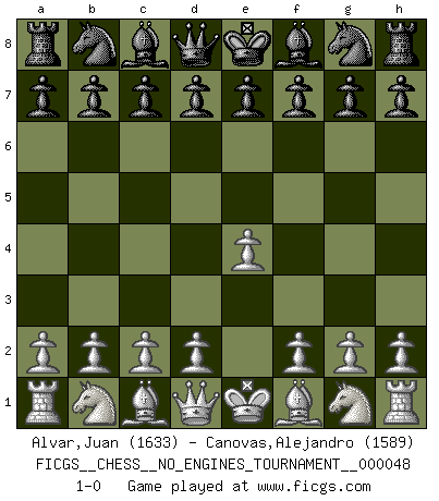 Last move : 1-0 2011 November 21 1:18:42 [Event "FICGS__CHESS__NO_ENGINES_TOURNAMENT__000048"] [Site "FICGS"] [Date "2011.10.10"] [Round "1"] [White "Alvar,Juan"] [Black "Canovas,Alejandro"] [Result "1-0"] [WhiteElo "1633"] [BlackElo "1589"] 1.e4 1-0 This chess game has been lost on time (started : 2011.10.10 21:55:44) King's pawn Opening Player White won this chess game. Follow this game move after move (download)A bad day of Chess is better than any good day at work. (Anonymous) Es gibt Leute, die glauben, alles wäre vernünftig, was man mit einem ernsthaften Gesicht tut. (Georg Christoph Lichtenberg) El Ajedrez es una manera fabulosa para que los niños aprendan a autovalorarse y a autoestimarse. (Saudin Robovic) Tous ces prétendus hommes politiques sont les pions, les Cavaliers, les Tours ou les Fous d'une partie d'échecs qui se jouera tant qu'un hasard ne renversera pas l'échiquier. (Honoré de Balzac) Before all elsed, be armed. (Niccolo Machiavelli)