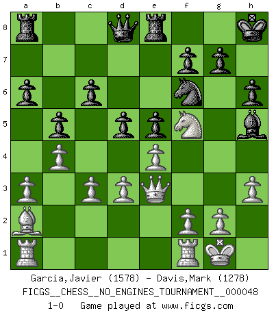 Last move : 1-0 2012 January 18 6:26:44 [Event "FICGS__CHESS__NO_ENGINES_TOURNAMENT__000048"] [Site "FICGS"] [Date "2011.10.10"] [Round "1"] [White "Garcia,Javier"] [Black "Davis,Mark"] [Result "1-0"] [WhiteElo "1578"] [BlackElo "1278"] 1.e4 e5 2.Nf3 Nc6 3.Bc4 Nf6 4.d3 Bb4+ 5.Bd2 Bxd2+ 6.Nbxd2 O-O 7.O-O h6 8.a3 d6 9.Nb1 Bg4 10.Nbd2 Nd4 11.c3 Nxf3+ 12.Nxf3 c6 13.h3 Bh5 14.Qe2 a6 15.Qe3 Re8 16.b4 b5 17.Ba2 d5 18.Nh4 Kh8 19.Nf5 1-0 This chess game has been lost on time (started : 2011.10.10 21:55:44) Two knights defense (Modern Bishop's Opening) Kingside Castling by player Black (move 6) Kingside Castling by player White (move 7) Player White won this chess game. Follow this game move after move (download)Whoever sees no other aim in the game than that of giving checkmate to one's opponent will never become a good Chess player. (Euwe) Darum geht es im Schach. Einen Tag gibst du deinem Gegner eine Lektion, am nächsten Tag gibt er dir eine. (Robert James Fischer) El Ajedrez es una guerra en un tablero. El objetivo es aplastar la mente del oponente. (Bobby Fischer) Il s'avisa de me proposer d'apprendre les échecs qu'il jouait un peu... me voilà forcené des échecs. J'achète un échiquier, je m'enferme dans ma chambre, j'y passe des jours et des nuits à vouloir apprendre par cur toutes les parties. (Jean-Jacques Rousseau, Confessions) Be who you are, and say what you feel because those who mind don't matter, and those who matter don't mind. (Dr Seuss)