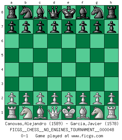 Last move : 0-1 2011 November 20 1:10:21 [Event "FICGS__CHESS__NO_ENGINES_TOURNAMENT__000048"] [Site "FICGS"] [Date "2011.10.10"] [Round "1"] [White "Canovas,Alejandro"] [Black "Garcia,Javier"] [Result "0-1"] [WhiteElo "1589"] [BlackElo "1578"] 0-1 This chess game has been lost on time (started : 2011.10.10 21:55:44) Player Black won this chess game. Follow this game move after move (download)Kasparov : J'adoube , Ivanchuk : S'il vous plaît ! (Garry Kasparov & Vassily Ivanchuk, Linares 1997) Wenn ich einen Club besuche, sind die Spieler stumm vor Staunen. (José Raúl Capablanca) Cuando tu no sabes absolutamente que mas hacer, es tiempo de entrar en pánico. (John van der Wiel) D'abord les bases : Jouez et étudiez, puis étudiez et jouez, ensuite jouez et étudiez, puis étudiez et jouez. Deuxièmement : Donnez toujours le meilleur de vous-même ! (Ken Smith) If we knew what we were doing, we would not call it research. (Albert Einstein)