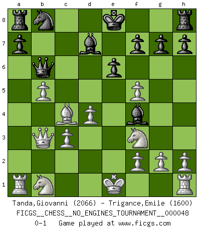Last move : 0-1 2012 January 11 5:52:20 [Event "FICGS__CHESS__NO_ENGINES_TOURNAMENT__000048"] [Site "FICGS"] [Date "2011.10.10"] [Round "1"] [White "Tanda,Giovanni"] [Black "Trigance,Emile"] [Result "0-1"] [WhiteElo "2066"] [BlackElo "1600"] 1.d4 d5 2.Bf4 Nf6 3.e3 e6 4.Nf3 c5 5.c3 c4 6.b3 b5 7.a4 Qb6 8.axb5 Bd7 9.bxc4 dxc4 10.Bxc4 Nd5 11.Qb3 Nxf4 12.exf4 Bd6 13.f5 Bf4 0-1 This chess game has been lost on time (started : 2011.10.10 21:55:44) Queen's pawn, Mason variation Player Black won this chess game. Follow this game move after move (download)Chess is the art of analysis. (Mikhail Botvinnik) Ein Buch ist ein Spiegel; wenn ein Affe hineinsieht, so kann kein Apostel heraus gucken. (Georg Christoph Lichtenberg) Un Peón pasado aumenta su poder a medida de que el número de piezas en el tablero disminuye. (Capablanca) Karpov est une pièce de musée. (Garry Kasparov) You cannot beat a roulette table unless you steal money from it. (Albert Einstein)