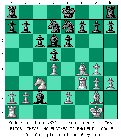 Last move : 1-0 2012 January 2 5:34:21 [Event "FICGS__CHESS__NO_ENGINES_TOURNAMENT__000048"] [Site "FICGS"] [Date "2011.10.10"] [Round "1"] [White "Medearis,John"] [Black "Tanda,Giovanni"] [Result "1-0"] [WhiteElo "1789"] [BlackElo "2066"] 1.d4 d5 2.Nf3 c6 3.Nc3 Bf5 4.Nh4 Bg4 5.h3 Bh5 6.g4 e6 7.Bg2 Qxh4 8.Qd3 Bg6 9.Qg3 Qxg3 10.fxg3 Bxc2 11.O-O Bd6 12.Rf3 Nd7 13.Be3 Ne7 14.Bf4 1-0 This chess game has been lost on time (started : 2011.10.10 21:55:44) Queen's pawn game Kingside Castling by player White (move 11) Player White won this chess game. Follow this game move after move (download)Nowadays, when you're not a grandmaster at 14, you can forget about it. (Anand Viswanathan) Wenn Spassky eine Figur opfert kannst du genauso gut aufgeben. Aber wenn Tal eine Figur opfert, spiel weiter. Er könnte noch eine weitere opfern, und dann ... wer weiß? (Miguel Najdorf) Aquel que toma al Peón de Caballo de la Reina, se pasará la noche a dormir en la calle. (Anónimo) On n'a jamais que l'âge auquel on a commence à jouer aux échecs car après on cesse de vieillir. (Capablanca) The worth of a book is to be measured by what you can carry away from it. (James Bryce)
