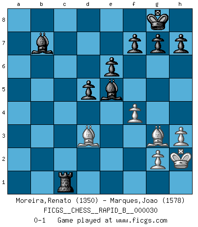 Last move : 0-1 2007 April 21 16:1:42 [Event "FICGS__CHESS__RAPID_B__000030"] [Site "FICGS"] [Date "2007.01.03"] [Round "1"] [White "Moreira,Renato"] [Black "Marques,Joao"] [Result "0-1"] [WhiteElo "1350"] [BlackElo "1578"] 1.e4 c5 2.Nf3 e6 3.d4 cxd4 4.Nxd4 a6 5.Nc3 Qc7 6.Be2 Bb4 7.Bd2 Nf6 8.f3 Nc6 9.Nxc6 bxc6 10.a3 Bc5 11.Bg5 d5 12.exd5 Nxd5 13.Qd2 O-O 14.Ne4 Bb6 15.Bh4 Bb7 16.Bg3 Qd7 17.c4 Rad8 18.cxd5 cxd5 19.Nf2 Qa4 20.O-O Rc8 21.Bd3 Ba5 22.b4 Bb6 23.Kh1 Rc6 24.Rfc1 Rfc8 25.Ng4 Rxc1+ 26.Rxc1 Qxa3 27.h3 Qxc1+ 28.Qxc1 Rxc1+ 29.Kh2 a5 30.bxa5 Bxa5 31.Ne5 Bc7 32.f4 Bxe5 0-1 Sicilian : Kan, 5.Nc3 Kingside Castling by player Black (move 13) Kingside Castling by player White (move 20) Player Black won this chess game. Follow this game move after move (download)He who fears an isolated Queen's Pawn should give up Chess. (Siegbert Tarrasch) Warum muß ich gegen diesen IDIOTEN verlieren? (Aaron Nimzowitsch) El tablero es el mundo, las piezas es el fenomeno del universo, las reglas del juego son lo que llamamos leyes de la naturaleza y el jugador del lado opuesto, se encuentra oculto a nuestra vista. (Thomas Huxley) Echiquier : carré parfait, comme la Jérusalem nouvelle décrite par l'auteur de l'Apocalypse, huit cases sur huit, exaltation du chiffre 4, symbole du cosmos aux quatre horizons... où le noir et le blanc, l'ombre et la lumière, le mal et le bien s'entremêlent et se conjuguent. (Robert Couffignal, Le Gambit du poète) Drag your thoughts away from your troubles... by the ears, by the heels, or any other way you can manage it. (Mark Twain)