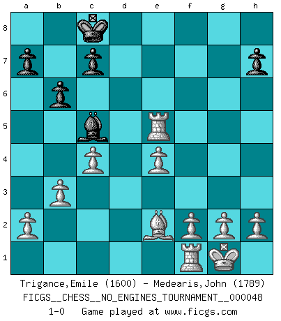Last move : 1-0 2011 November 9 21:54:41 [Event "FICGS__CHESS__NO_ENGINES_TOURNAMENT__000048"] [Site "FICGS"] [Date "2011.10.10"] [Round "1"] [White "Trigance,Emile"] [Black "Medearis,John"] [Result "1-0"] [WhiteElo "1600"] [BlackElo "1789"] 1.e4 e5 2.Nf3 d6 3.d4 Nc6 4.dxe5 dxe5 5.Qxd8+ Nxd8 6.Nxe5 Be6 7.c4 f6 8.Nf3 Nc6 9.Bd2 O-O-O 10.b3 Bc5 11.Nc3 Nge7 12.Be2 Rhg8 13.Nd5 Rd7 14.O-O g5 15.Bc3 Bf7 16.Nxf6 Rg6 17.Nxd7 Kxd7 18.Rad1+ Rd6 19.Nxg5 Kc8 20.Nxf7 Rf6 21.Bxf6 Ng6 22.Rd5 b6 23.Ne5 Ncxe5 24.Bxe5 Nxe5 25.Rxe5 1-0 Philidor's defense Queenside Castling by player Black (move 9) Kingside Castling by player White (move 14) Player White won this chess game. Follow this game move after move (download)Fischer sacrificed virtually everything most of us weakies (to use his term) value, respect, and cherish, for the sake of an artful, often beautiful board game, for the ambivalent privilege of being its greatest master. (Paul Kollar) Schach verlangt totale Konzentration. (Robert James Fischer) Hoy en día, si tu no eres un Gran Maestro a los 14 años, es mejor que lo olvides. (Anand Viswanathan) La vérité est comme le meilleur coup aux échecs : elle existe, mais il faut la chercher. (Arturo Perez-Reverte) Either move or be moved. (Ezra Pound)