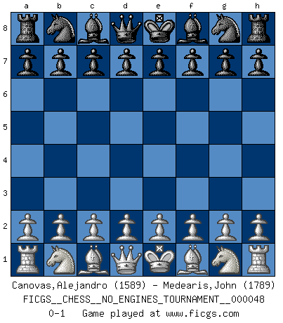 Last move : 0-1 2011 November 20 1:10:21 [Event "FICGS__CHESS__NO_ENGINES_TOURNAMENT__000048"] [Site "FICGS"] [Date "2011.10.10"] [Round "1"] [White "Canovas,Alejandro"] [Black "Medearis,John"] [Result "0-1"] [WhiteElo "1589"] [BlackElo "1789"] 0-1 This chess game has been lost on time (started : 2011.10.10 21:55:44) Player Black won this chess game. Follow this game move after move (download)First-class players lose to second-class players because second-class players sometimes play a first-class game. (Siegbert Tarrasch) Die Fehler sind da, Sie warten nur darauf gemacht zu werden. (Savielly Grigorievitsch Tartakower) El Ajedrez es parte de la cultura, y si una cultura esta en decadencia, entonces también el Ajedrez declinará. (Mikhail Botvinnik) Soyez une menace à chaque fois que vous vous asseyez pour jouer. (Ken Smith) Life is like a ten-speed bicycle: most of us have gears we never use. (Charles M. Schulz)