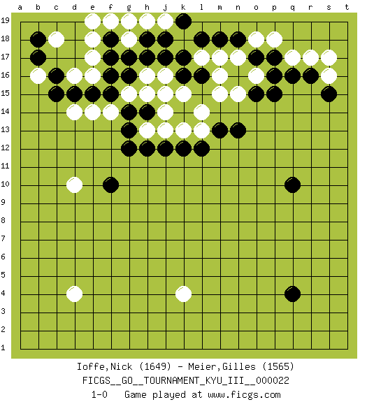 Last move : 1-0 2011 November 8 22:14:46 [Event "FICGS__GO__TOURNAMENT_KYU_III__000022"] [Site "FICGS"] [Date "2011.10.12"] [Round "1"] [Black "Ioffe,Nick"] [White "Meier,Gilles"] [Result "1-0"] [Rating 1 "1649"] [Rating 2 "1565"] 1.q16 d4 2.q4 d16 3.q10 d10 4.k16 k4 5.f10 r17 6.r16 q17 7.p17 p18 8.o17 o18 9.n18 s16 10.s15 s17 11.p15 n17 12.m18 m17 13.l18 l17 14.k17 o16 15.p16 m15 16.m13 l14 17.k12 j14 18.g16 e17 19.g14 l13 20.l12 k13 21.h12 h13 22.g13 k15 23.l16 m16 24.o15 n15 25.n13 j16 26.j17 h16 27.h17 h15 28.h14 j13 29.j12 g15 30.f15 j15 31.f17 f14 32.e15 e14 33.g12 g18 34.f18 e18 35.g19 h19 36.d15 d14 37.c15 f19 38.h18 j19 39.k19 g19 40.g17 k18 41.j18 e19 42.b17 e16 43.f16 b16 44.c16 c18 45.b18 1-0 Here are the names of the openings (joseki) played in the four corners : Corner q16 : q16 r17 Hoshi (Hwajeom, Seongjeom, Xingwei`) 4-4 Point. The star or hoshi (4-4) point, emphasizing influence at the potential expense of territory. Player Black won this Go (weiqi, baduk) game. Follow this game move after move (download)If White takes all four corners, Black should resign; if Black takes all four corners, Black should also resign. (David Kent) He who fights with monsters should be careful lest he thereby become a monster. (Friedrich Nietzsche, Beyond Good and Evil)
