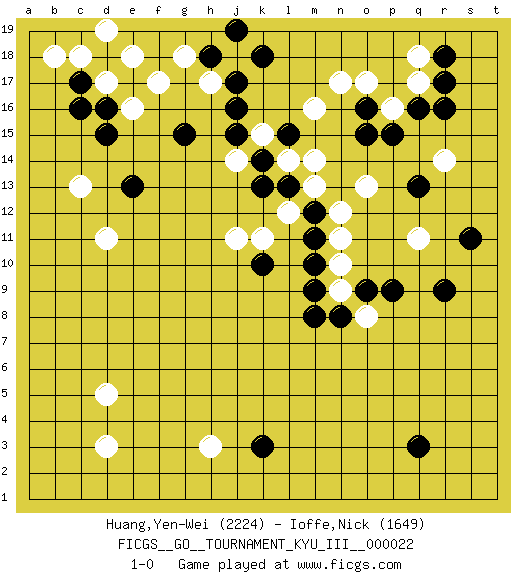 Last move : 1-0 2012 February 6 7:10:3 [Event "FICGS__GO__TOURNAMENT_KYU_III__000022"] [Site "FICGS"] [Date "2011.10.12"] [Round "1"] [Black "Huang,Yen-Wei"] [White "Ioffe,Nick"] [Result "1-0"] [Rating 1 "2224"] [Rating 2 "1649"] 1.q16 d17 2.q3 d3 3.d15 c13 4.c17 c18 5.c16 b18 6.e17 e18 7.d16 f17 8.d18 d19 9.e13 d11 10.g15 h17 11.j16 d5 12.j17 j18 13.k18 g18 14.j19 d17 15.k3 h3 16.r9 q11 17.p9 r14 18.r16 o17 19.o15 m16 20.s11 q18 21.r18 q17 22.r17 p16 23.p15 m14 24.o16 n17 25.h18 e16 26.m12 l12 27.l13 m13 28.k13 n12 29.m11 o13 30.q13 n11 31.m10 n10 32.m9 n9 33.n8 o8 34.o9 k11 35.k10 j11 36.m8 j14 37.l15 l14 38.k14 k15 39.j15 1-0 Here are the names of the openings (joseki) played in the four corners : Corner d16 : d17 d15 Komoku (Somok, Xiao~mu`) 3-4 Point. The komoku (3-4) point is the traditional corner enclosure move.. Ikken Takagakari (Hankan Nop'dakeolch'im, Yi Gaogua`jiao~, 1-Space High Approach). The 5-4 approach move has become more popular in modern times, as modern Go emphasizes speed and influence. Corner q16 : q16 q11 Hoshi (Hwajeom, Seongjeom, Xingwei`) 4-4 Point. The star or hoshi (4-4) point, emphasizing influence at the potential expense of territory. Player Black won this Go (weiqi, baduk) game. Follow this game move after move (download)The nature of a game comes from what is played, but it's the sensitivity to the possible and the impossible that gives it value. (Pierre Audouard) You can't play chess if you're groggy from pills. (Anatoly Karpov)