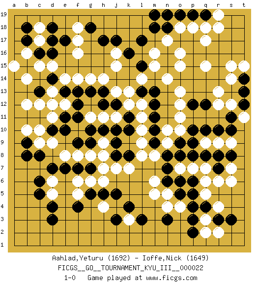 Last move : 1-0 2012 April 24 22:15:4 [Event "FICGS__GO__TOURNAMENT_KYU_III__000022"] [Site "FICGS"] [Date "2011.10.12"] [Round "1"] [Black "Aahlad,Yeturu"] [White "Ioffe,Nick"] [Result "1-0"] [Rating 1 "1692"] [Rating 2 "1649"] 1.d4 q5 2.d16 q15 3.d10 q17 4.k4 q3 5.r10 f16 6.d14 f14 7.e17 f17 8.l17 n17 9.h17 f18 10.f13 g14 11.d7 c17 12.d17 c18 13.d18 c15 14.c16 b16 15.b15 b14 16.b17 a15 17.b18 c12 18.d12 b10 19.b9 c10 20.n3 r12 21.r7 s6 22.l15 j16 23.d3 c9 24.c8 d9 25.e10 e8 26.e7 f8 27.c13 b12 28.g7 d15 29.g10 h9 30.g9 g8 31.h10 h8 32.k10 k13 33.j17 n14 34.k16 j15 35.l13 l12 36.m13 o12 37.m12 l11 38.m11 l10 39.j9 l8 40.k8 j11 41.k11 k12 42.j10 k7 43.j12 h11 44.h13 j13 45.h12 h14 46.m9 l9 47.g13 e14 48.m10 h4 49.j5 k3 50.j3 h7 51.h5 p7 52.p10 q9 53.q10 r9 54.s10 s9 55.l3 g6 56.p2 q2 57.p3 o10 58.o9 o11 59.q12 r13 60.p12 o13 61.p9 n9 62.n8 n10 63.p8 o7 64.o8 m8 65.n7 m6 66.n6 q7 67.n15 o15 68.n16 o16 69.q8 s7 70.r8 r6 71.t13 s14 72.t14 t15 73.t12 s12 74.s11 s15 75.g5 f6 76.b8 m15 77.g18 m16 78.m18 l14 79.p19 o18 80.o19 n19 81.n18 p18 82.q19 r19 83.m19 q18 84.n19 r18 85.s8 e12 86.e13 d11 87.e11 d13 88.f12 d12 89.j8 j7 90.f9 g11 91.f11 n5 92.o5 f5 93.f7 h6 94.f4 d5 95.c5 d6 96.c6 m5 97.p6 q6 98.o6 o4 99.p4 n4 100.q4 r4 101.p5 t11 102.r3 r2 103.s3 1-0 Here are the names of the openings (joseki) played in the four corners : Corner d16 : d16 f16 Hoshi (Hwajeom, Seongjeom, Xingwei`) 4-4 Point. The star or hoshi (4-4) point, emphasizing influence at the potential expense of territory. Ikken Takagakari (Hankan Nop'dakeolch'im, Yi Gaojia, 1-Space High Approach). Black typically responds at 6-4 or 3-10. Black 4-10 is played when Black finds play on the right side advantageous. Black 4-8 or 3-8 may be played when Black has support at top. Player Black won this Go (weiqi, baduk) game. Follow this game move after move (download)Fighting must not be the key to go, it should be reserved as your last resource. (Zhong-Pu Liu, about Weiqi) Thus, what is of supreme importance in war is to attack the enemy's strategy. (Sun Tzu)