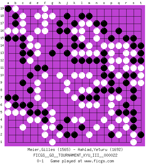 Last move : 0-1 2012 March 27 7:36:14 [Event "FICGS__GO__TOURNAMENT_KYU_III__000022"] [Site "FICGS"] [Date "2011.10.12"] [Round "1"] [Black "Meier,Gilles"] [White "Aahlad,Yeturu"] [Result "0-1"] [Rating 1 "1565"] [Rating 2 "1692"] 1.q16 d4 2.d16 q4 3.c6 f3 4.c9 f17 5.e17 f16 6.c14 k16 7.r6 n3 8.r9 r14 9.r15 q14 10.o17 r11 11.s4 r3 12.s3 c5 13.d6 k4 14.l18 f6 15.j18 e9 16.d10 e14 17.o8 d12 18.c12 m8 19.o10 m10 20.e11 f10 21.f11 h10 22.h16 d15 23.c15 c17 24.d17 e18 25.d18 g18 26.h17 c18 27.e19 c16 28.c19 f18 29.b18 e16 30.d19 b19 31.b17 b16 32.a19 a16 33.b15 f19 34.e5 b5 35.b6 e4 36.f5 g5 37.f4 g4 38.g13 k13 39.h14 n6 40.o12 o14 41.k12 l13 42.l12 m13 43.m12 n13 44.n12 n16 45.n17 m17 46.m18 l17 47.k17 k10 48.o16 n15 49.s12 r12 50.s14 s13 51.t13 r13 52.s15 s11 53.t12 t11 54.t14 s9 55.k14 l15 56.l14 m14 57.j13 s2 58.s8 t9 59.s7 p6 60.l9 l10 61.m9 n9 62.n8 l8 63.k9 j9 64.k8 k7 65.m7 j8 66.n7 m6 67.k15 o9 68.p9 p7 69.p8 q7 70.q8 r4 71.r5 d14 72.a15 b19 73.d13 e13 74.c13 a6 75.a7 a5 76.b7 q10 77.p10 p11 78.r10 p12 79.o13 p13 80.s10 t10 81.o11 e7 82.l7 l6 83.p15 p14 84.j16 l16 85.d5 c3 86.g2 f2 87.k2 h2 88.h3 g3 89.j2 g1 90.j4 m2 91.l3 l4 92.q5 p5 93.q11 q12 94.d8 e8 95.p4 q2 96.t2 s1 97.s5 o4 98.p2 p3 0-1 Here are the names of the openings (joseki) played in the four corners : Corner d4 : d4 c6 Hoshi (Hwajeom, Seongjeom, Xingwei`) 4-4 Point. The star or hoshi (4-4) point, emphasizing influence at the potential expense of territory. Ikken Kakari (Hankan Keolch'im, Yi Gua`jiao~, 1-Space Low Approach). Black 2 is the standard approach move to the 4-4. Corner d16 : d16 f17 Hoshi (Hwajeom, Seongjeom, Xingwei`) 4-4 Point. The star or hoshi (4-4) point, emphasizing influence at the potential expense of territory. Ikken Kakari (Hankan Keolch'im, Yi Gua`jiao~, 1-Space Low Approach). White 2 is the standard approach move to the 4-4. Corner q4 : q4 r6 Hoshi (Hwajeom, Seongjeom, Xingwei`) 4-4 Point. The star or hoshi (4-4) point, emphasizing influence at the potential expense of territory. Ikken Kakari (Hankan Keolch'im, Yi Gua`jiao~, 1-Space Low Approach). Black 2 is the standard approach move to the 4-4. Corner q16 : q16 r14 Hoshi (Hwajeom, Seongjeom, Xingwei`) 4-4 Point. The star or hoshi (4-4) point, emphasizing influence at the potential expense of territory. Ikken Kakari (Hankan Keolch'im, Yi Gua`jiao~, 1-Space Low Approach). White 2 is the standard approach move to the 4-4. Player White won this Go (weiqi, baduk) game. Follow this game move after move (download)Don't try to enclose an open skirt. (Anonymous) I couldn't make any sense out of what this particular thread is about. It sounds like R2 D2 computer speaking. A space fight ?!? Some 'command' problems in Moscow ? Some killers & narcotic addicts attacking some game & a god wannabe ?? (Dinesh De Silva, lost in a russian conflict in FICGS forum)