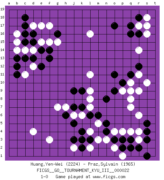 Last move : 1-0 2012 April 3 13:12:36 [Event "FICGS__GO__TOURNAMENT_KYU_III__000022"] [Site "FICGS"] [Date "2011.10.12"] [Round "1"] [Black "Huang,Yen-Wei"] [White "Praz,Sylvain"] [Result "1-0"] [Rating 1 "2224"] [Rating 2 "1965"] 1.q16 d4 2.q3 d17 3.d15 d12 4.g16 e15 5.e14 f15 6.d16 f17 7.c17 e17 8.f14 g15 9.c18 d14 10.d13 c14 11.c13 b15 12.c15 b14 13.b13 b16 14.c16 e13 15.b11 c11 16.b12 q4 17.f13 r3 18.p3 p4 19.o3 o4 20.r2 n3 21.s3 r4 22.s1 l16 23.e12 r14 24.o17 q10 25.n4 m3 26.n5 o2 27.p2 p1 28.q2 l4 29.s4 r6 30.s5 q7 31.m6 l7 32.n8 f3 33.l6 k6 34.k7 l8 35.o9 j6 36.q9 r9 37.r10 p9 38.p10 q8 39.q11 q9 40.o11 r11 41.r12 s10 42.j7 h7 43.k9 l9 44.j9 l11 45.h6 g7 46.k4 k3 47.j5 r17 48.r16 s16 49.q17 s18 50.r18 s17 51.j3 j2 52.k2 l2 53.l3 m5 54.k3 1-0 Here are the names of the openings (joseki) played in the four corners : Corner d16 : d17 d15 Komoku (Somok, Xiao~mu`) 3-4 Point. The komoku (3-4) point is the traditional corner enclosure move.. Ikken Takagakari (Hankan Nop'dakeolch'im, Yi Gaogua`jiao~, 1-Space High Approach). The 5-4 approach move has become more popular in modern times, as modern Go emphasizes speed and influence. Corner q4 : q3 q4 Komoku (Somok, Xiao~mu`) 3-4 Point. The komoku (3-4) point is the traditional corner enclosure move.. Corner q16 : q16 l16 Hoshi (Hwajeom, Seongjeom, Xingwei`) 4-4 Point. The star or hoshi (4-4) point, emphasizing influence at the potential expense of territory. Player Black won this Go (weiqi, baduk) game. Follow this game move after move (download)If you lose by one point, take a rest. (Anonymous) Don't be discouraged. It's often the last key in the bunch that opens the lock. (Author unknown)
