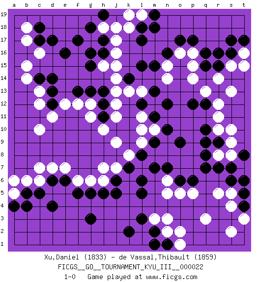 Last move : 1-0 2012 February 23 19:36:38 [Event "FICGS__GO__TOURNAMENT_KYU_III__000022"] [Site "FICGS"] [Date "2011.10.12"] [Round "1"] [Black "Xu,Daniel"] [White "de Vassal,Thibault"] [Result "1-0"] [Rating 1 "1833"] [Rating 2 "1859"] 1.q16 c16 2.d4 q3 3.e16 r5 4.c17 b17 5.d17 b15 6.d14 c13 7.d13 c12 8.d12 j17 9.l17 j15 10.l15 g17 11.g15 j13 12.o17 r14 13.s16 r11 14.l3 c6 15.d6 c7 16.c5 c10 17.g3 n3 18.l5 n5 19.q10 r10 20.q8 r8 21.r7 s8 22.q7 j11 23.s7 j9 24.o9 j7 25.j5 p14 26.g13 h6 27.h5 g6 28.g5 d11 29.p12 q13 30.n12 g11 31.h12 j12 32.f17 s15 33.r16 t16 34.t17 t15 35.s17 k18 36.l18 h15 37.g16 d7 38.e6 e7 39.m2 n2 40.t5 s4 41.n1 o1 42.m1 o2 43.h16 j16 44.h17 h18 45.g18 l19 46.m19 k19 47.m18 n14 48.m9 l7 49.m7 s5 50.s6 b18 51.c18 p16 52.p17 o16 53.t4 t3 54.t6 s2 55.o6 o5 56.p6 p5 57.l8 k8 58.l6 l9 59.k7 l10 60.b5 b6 61.r9 s9 62.q9 f6 63.f5 a5 64.a4 a6 65.b4 g12 66.h13 f12 67.c14 b14 68.f13 e12 69.n16 n15 70.m15 l13 71.q12 r12 72.t8 s10 73.m11 m10 74.n10 l11 75.h19 j18 76.j6 h7 77.r15 s13 78.q15 p15 79.h11 h10 80.k14 j14 81.m13 k13 82.l12 n6 83.n7 m3 84.k2 1-0 Here are the names of the openings (joseki) played in the four corners : Corner d16 : c16 e16 Komoku (Somok, Xiao~mu`) 3-4 Point. The komoku (3-4) point is the traditional corner enclosure move.. Ikken Takagakari (Hankan Nop'dakeolch'im, Yi Gaogua`jiao~, 1-Space High Approach). The 5-4 approach move has become more popular in modern times, as modern Go emphasizes speed and influence. Corner d4 : d4 c6 Hoshi (Hwajeom, Seongjeom, Xingwei`) 4-4 Point. The star or hoshi (4-4) point, emphasizing influence at the potential expense of territory. Ikken Kakari (Hankan Keolch'im, Yi Gua`jiao~, 1-Space Low Approach). White 2 is the standard approach move to the 4-4. Player Black won this Go (weiqi, baduk) game. Follow this game move after move (download)Every move brings change. (Pierre Audouard) May I never be complete. May I never be content. May I never be perfect. Deliver me, Tyler, from being perfect and complete. (Chuck Palahniuk, Fight Club)