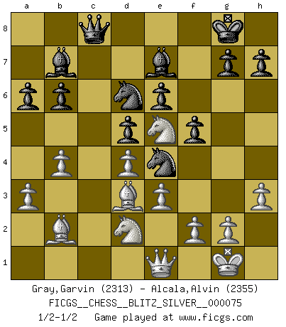 Last move : 1/2-1/2 2011 October 12 11:35:25 [Event "FICGS__CHESS__BLITZ_SILVER__000075"] [Site "FICGS"] [Date "2011.10.12"] [Round "1"] [White "Gray,Garvin"] [Black "Alcala,Alvin"] [Result "1/2-1/2"] [WhiteElo "2313"] [BlackElo "2355"] 1.d4 Nf6 2.Nf3 d5 3.e3 e6 4.Bd3 c5 5.c3 Nc6 6.Nbd2 Be7 7.b3 O-O 8.O-O b6 9.Bb2 Bb7 10.Rc1 Rc8 11.Qe2 Rc7 12.a3 cxd4 13.cxd4 Qb8 14.h3 Rfc8 15.b4 Nd8 16.Rxc7 Rxc7 17.Rc1 Rxc1+ 18.Bxc1 Ne4 19.Qd1 Qc8 20.Bb2 a6 21.Qb1 f5 22.Qe1 Nf7 23.Ne5 Nfd6 1/2-1/2 Queen's pawn game Kingside Castling by player Black (move 7) Kingside Castling by player White (move 8) This chess game ended in a draw. Follow this game move after move (download)All that matters on the Chessboard is good moves. (Bobby Fischer) Ich tröste mich mit dem Vergnügen, daß Schachfans, Zuschauer und Leser glücklich sind, wenn ein Großmeister etwas riskiert, statt nur Klötzchen zu schieben. (Mikhail Nekhemyevich Tal) En partidas rápidas, el Caballo es mas poderoso que el Alfil. (Vlastimil Hort) Le plus grand jeu de l'esprit jamais inventé, plus vous l'apprenez, plus vous y prenez du plaisir. (Garry Kasparov) Bobby never cared about money, though. His only desire was to prove that his choices were correct: He wanted chess to be important because he was a chess player, and he wanted to be important. Bobby knew money was important, but he didn't have a clue why, outside of clothes and status. The only way he could accomplish what he wanted was to fight for a lot of money. Once he got it, he gave it away. He did not know how to spend it. And once he'd become champion, after, essentially, sacrificing his life for it, he didn't know how to spend his time. (Bob Wade)