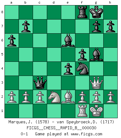 Last move : 0-1 2007 February 2 12:46:39 [Event "FICGS__CHESS__RAPID_B__000030"] [Site "FICGS"] [Date "2007.01.03"] [Round "1"] [White "Marques,Joao"] [Black "van Speybroeck,Dirk-Jan"] [Result "0-1"] [WhiteElo "1578"] [BlackElo "1717"] 1.e4 c5 2.Nf3 d6 3.d4 cxd4 4.Nxd4 Nf6 5.Nc3 a6 6.Be2 e5 7.Nb3 Be7 8.Be3 Be6 9.Qd2 Nbd7 10.O-O O-O 11.Bg5 d5 12.Bxf6 Nxf6 13.exd5 Nxd5 14.Rad1 Nf4 15.Qe3 Qc7 16.Bd3 Rad8 17.Rd2 Bg5 18.Qf3 f5 19.Be2 e4 20.Qg3 Rxd2 21.Nxd2 Qxc3 0-1 Sicilian : Najdorf, Opovcensky variation Kingside Castling by player White (move 10) Kingside Castling by player Black (move 10) Player Black won this chess game. Follow this game move after move (download)The combination player thinks forward; he starts from the given position, and tries the forceful moves in his mind. (Emanuel Lasker) In der Schule lernt man nichts. Es ist nur Zeitverschwendung. (Robert James Fischer) En posiciones complicadas, Bobby Fischer pocas veces tuvo que temer de cualquiera. (Paul Keres) L'attaque fait le spectacle, la défense gagne les matchs. (Dicton footballistique) A generalist learns less and less about more and more until he knows nothing about everything. (Author unknown)