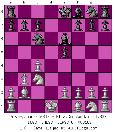 Last move : 1-0 2011 December 19 4:44:42 [Event "FICGS__CHESS__CLASS_C__000182"] [Site "FICGS"] [Date "2011.10.13"] [Round "1"] [White "Alvar,Juan"] [Black "Bilz,Constantin"] [Result "1-0"] [WhiteElo "1633"] [BlackElo "1733"] 1.c4 d6 2.d4 e5 3.dxe5 dxe5 4.Nc3 Qxd1+ 5.Kxd1 Be6 6.b3 Nc6 7.Bb2 1-0 This chess game has been lost on time (started : 2011.10.13 18:20:38) English Opening Player White won this chess game. Follow this game move after move (download)You may learn much more from a game you lose than from a game you win. You will have to lose hundreds of games before becoming a good player. (Jose Raul Capablanca) Mit Schach schule ich mein Gefühl für Geometrie, was für Tennis und Schach gleichermaßen wichtig ist. (Boris Becker) Vive, pierde y aprende al observar a tu oponente como ganar. (Amber Steenbock) On n'a jamais que l'âge auquel on a commence à jouer aux échecs car après on cesse de vieillir. (Capablanca) In my experience, there's no such thing as luck. (Obi-Wan Kenobi in Star Wars ep.4)