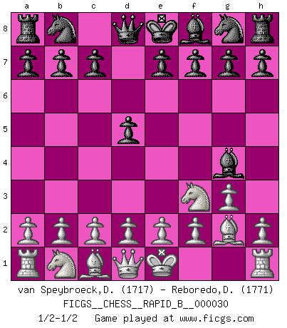 Last move : 1/2-1/2 2007 January 6 17:14:4 [Event "FICGS__CHESS__RAPID_B__000030"] [Site "FICGS"] [Date "2007.01.03"] [Round "1"] [White "van Speybroeck,Dirk-Jan"] [Black "Reboredo,Daniel"] [Result "1/2-1/2"] [WhiteElo "1717"] [BlackElo "1771"] 1.Nf3 d5 2.g3 Bg4 3.Bg2 1/2-1/2 Reti : King's Indian attack (Barcza system) This chess game ended in a draw. Follow this game move after move (download)Good offense and good defense both begin with good development. (Bruce A. Moon) Obendrein hat der FIDE-Präsident den Revolutionsführer Gaddafi zum »Großmeister« ernannt, am Ende der WM. Das ist lächerlich! (Joel Lautier) Un juego de Ajedrez es un dialogo, una conversación entre un jugador y su oponente. Cada movimiento del oponente puede contener amenazas o tropiezos, pero un jugador no se puede defender de las amenazas o tomar ventaja de los tropiezos si es que no se pregunta a sí mismo: ¿Que es lo que mi oponente va a hacer después de cada movida?. (Bruce A. Moon) On est toujours la mazette de quelqu'un d'autre. (Anonyme) Always two there are. No more no less. A master, and an apprentice. (Master Yoda in Star Wars ep.1)