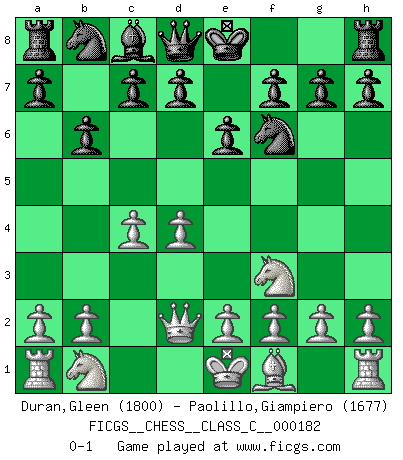 Last move : 0-1 2011 November 27 14:13:28 [Event "FICGS__CHESS__CLASS_C__000182"] [Site "FICGS"] [Date "2011.10.13"] [Round "1"] [White "Duran,Gleen"] [Black "Paolillo,Giampiero"] [Result "0-1"] [WhiteElo "1800"] [BlackElo "1677"] 1.d4 Nf6 2.c4 e6 3.Nf3 Bb4+ 4.Bd2 Bxd2+ 5.Qxd2 b6 0-1 This chess game has been lost on time (started : 2011.10.13 18:20:38) Bogo-Indian defense Player Black won this chess game. Follow this game move after move (download)When the Chess game is over, the Pawn and the King go back to the same box. (Irish saying) Früher wurde jeder komplizierte Zug, jedes interessante Opfer mit großem Beifall und Enthusiasmus aufgenommen. Heute schaltet man einfach seinen Fritz an, und man kann sehen, was los ist, ob der Zug geht oder nicht. (Vladimir Kramnik) Las leyes del Ajedrez no permiten una libre elección: tienes que mover quieras o no. (Emanuel Lasker) Plusieurs personnes se sont demandées comment Tal faisait pour gagner... En fait, c'est très simple ! Il met ses pièces au centre de l'échiquier et les sacrifie quelque part ! (David Bronstein) Memory... is the diary that we all carry with us. (Oscar Wilde, The Importance of Being Earnest)