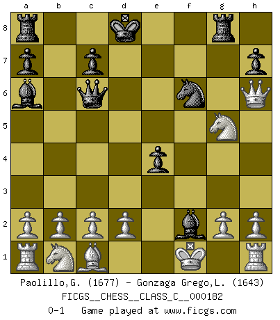 Last move : 0-1 2011 November 6 21:58:59 [Event "FICGS__CHESS__CLASS_C__000182"] [Site "FICGS"] [Date "2011.10.13"] [Round "1"] [White "Paolillo,Giampiero"] [Black "Gonzaga Grego,Luis"] [Result "0-1"] [WhiteElo "1677"] [BlackElo "1643"] 1.e4 e5 2.Nf3 Nc6 3.Bc4 Nf6 4.Ng5 d5 5.exd5 b5 6.Bxb5 Qxd5 7.Bxc6+ Qxc6 8.Qf3 e4 9.Qb3 Bc5 10.Qxf7+ Kd8 11.Qxg7 Rg8 12.Qh6 Bxf2+ 13.Kf1 Ba6+ 0-1 Two knights defense : Ulvestad variation Player Black won this chess game. Follow this game move after move (download)Of Chess it has been said that life is not long enough for it, but that is the fault of life, not Chess. (William Ewart Napier) Schach ist eine Sache der genauen Beurteilung, wann man zuschlagen und wann man sich ducken muss. (Robert James Fischer) El Ajedrez lo es todo: arte, ciencia y deporte. (Anatoly Karpov) Les échecs sont un jeu terrible. Si vous n'avez pas le centre, votre adversaire a une position plus libre. Par contre, si vous avez le centre, alors vous avez vraiment quelque chose pour laquelle vous inquiéter ! (Siegbert Tarrasch) Panic is a sudden desertion of us, an a going over to the enemy of our imagination. (Christian Nevell Bovee)