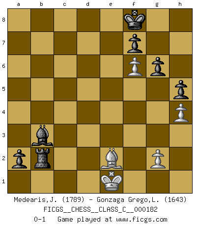 Last move : 0-1 2011 November 27 20:59:29 [Event "FICGS__CHESS__CLASS_C__000182"] [Site "FICGS"] [Date "2011.10.13"] [Round "1"] [White "Medearis,John"] [Black "Gonzaga Grego,Luis"] [Result "0-1"] [WhiteElo "1789"] [BlackElo "1643"] 1.e4 e5 2.Nf3 Nc6 3.d4 exd4 4.Nxd4 Nf6 5.Nxc6 bxc6 6.Bd3 d5 7.exd5 cxd5 8.O-O Be7 9.Nc3 O-O 10.Bf4 c5 11.Re1 Be6 12.h3 Rc8 13.a3 d4 14.Ne4 c4 15.Nxf6+ Bxf6 16.Be4 Bd5 17.Bf5 Rc5 18.Bg4 Qb6 19.Rb1 h6 20.Be5 Rd8 21.Bxf6 Qxf6 22.Qe2 g6 23.Qd2 Kg7 24.Qb4 Qc6 25.Re5 h5 26.Be2 Qd6 27.Bf1 Rb8 28.Qe1 Be6 29.Re2 Rcb5 30.Qc1 R5b7 31.h4 a5 32.Re4 Bf5 33.Re1 Rc8 34.Rd1 d3 35.c3 Bg4 36.Rd2 Qc5 37.Kh1 a4 38.f3 Be6 39.Qe1 Rcb8 40.Kh2 Bf5 41.f4 Re7 42.Qg3 Rbe8 43.Rbd1 Bg4 44.Rb1 Re4 45.Rc1 Qd6 46.f5 Rf4 47.Rf2 d2 48.Rd1 Bxd1 49.Rxf4 Bg4 50.f6+ Kf8 51.Rd4 Qxg3+ 52.Kxg3 d1Q 53.Rxd1 Bxd1 54.Kf2 Rb8 55.Ke1 Bg4 56.Bxc4 Rxb2 57.Bd5 Rb1+ 58.Kf2 Rb3 59.Ke3 Rxc3+ 60.Kd2 Rxa3 61.Kc2 Be6 62.Bc6 Ra2+ 63.Kd1 Bb3+ 64.Ke1 a3 65.Bb5 Rb2 66.Be2 a2 0-1 Scotch : Schmidt variation Kingside Castling by player White (move 8) Kingside Castling by player Black (move 9) Promotion Queen by player Black (move 52) Player Black won this chess game. Follow this game move after move (download)In blitz, the Knight is stronger than the Bishop. (Vlastimil Hort) Alles was ich jemals tun will ist Schach spielen. (Robert James Fischer) No existe un remordimiento como el remordimiento del Ajedrez. (H. G. Wells) La solitude du joueur d'Echecs à l'approche du mat est semblable à celle du condamné. (Francis Szpiner) If you know the enemy and know yourself you need not fear the results of a hundred battles. (Sun Tzu)