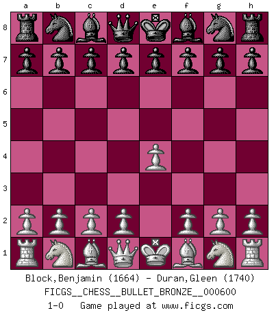 Last move : 1-0 2011 October 13 21:37:26 [Event "FICGS__CHESS__BULLET_BRONZE__000600"] [Site "FICGS"] [Date "2011.10.13"] [Round "1"] [White "Block,Benjamin"] [Black "Duran,Gleen"] [Result "1-0"] [WhiteElo "1664"] [BlackElo "1740"] 1.e4 1-0 This chess game has been lost on time (started : 2011.10.13 20:50:59) King's pawn Opening Player White won this chess game. Follow this game move after move (download)Bobby Fischer is the greatest Chess genius of all time ! (Alexander Kotov) Ich hatte Zahnschmerzen im ersten Spiel. In der zweiten Partie tat mir der Kopf weh. In der dritten war es eine Rheuma-Attacke und während der vierten fühlte ich mich nicht gut. Und in der fünften? Nun, man muss doch nicht jedes Spiel gewinnen, oder? (Savielly Grigorievitsch Tartakower) Solo el jugador con la iniciativa tiene el derecho a atacar. (Wilhelm Steinitz) Les sacrifices démontrent seulement que quelqu'un a gaffé. (Savielly Tartacover) You can't play chess if you're groggy from pills. (Anatoly Karpov)