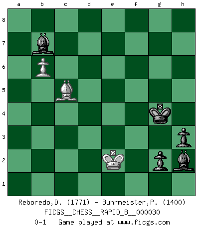 Last move : 0-1 2007 May 4 0:12:23 [Event "FICGS__CHESS__RAPID_B__000030"] [Site "FICGS"] [Date "2007.01.03"] [Round "1"] [White "Reboredo,Daniel"] [Black "Buhrmeister,Peter"] [Result "0-1"] [WhiteElo "1771"] [BlackElo "1400"] 1.e4 e5 2.Nf3 d6 3.d4 exd4 4.Nxd4 Nf6 5.Nc3 Be7 6.Be2 O-O 7.O-O Re8 8.Re1 Bf8 9.Bf1 Nbd7 10.f3 c6 11.b3 Ne5 12.Bb2 Nh5 13.Qd2 Qf6 14.Nde2 Qxf3 15.gxf3 Nxf3+ 16.Kh1 Nxd2 17.Bg2 f5 18.exf5 Bxf5 19.Nd4 Bg6 20.Ne6 d5 21.Nc7 Rxe1+ 22.Rxe1 Rc8 23.N7xd5 cxd5 24.Bxd5+ Bf7 25.Bxb7 Rc7 26.Bg2 Nf4 27.Rd1 Nxg2 28.Kxg2 Ne4 29.Nxe4 Rxc2+ 30.Rd2 Bd5 31.Rxc2 Bxe4+ 32.Kf1 Bxc2 33.Bd4 a6 34.Ke2 Bd6 35.Bg1 Kf7 36.Kd2 Bb1 37.Kc1 Bf5 38.Kb2 Kg6 39.a3 Be5+ 40.Kc1 Kg5 41.b4 Kg4 42.a4 Kh3 43.b5 axb5 44.axb5 Bxh2 45.Bd4 g5 46.b6 Be4 47.Kd2 g4 48.Ke3 Bb7 49.Ke2 g3 50.Kf1 g2+ 51.Ke2 h5 52.Kd3 Kg4 53.Ke2 h4 54.Bc5 h3 0-1 Philidor : Exchange variation Kingside Castling by player Black (move 6) Kingside Castling by player White (move 7) 10 pieces endgame at move 43 : White KBPP , Black KBBPPP WHITE : King + 1 Bishop 2 Pawns BLACK : King + 2 Bishops 3 Pawns 9 pieces endgame at move 44 : White KBPP , Black KBBPP WHITE : King + 1 Bishop 2 Pawns BLACK : King + 2 Bishops 2 Pawns 8 pieces endgame at move 44 : White KBP , Black KBBPP WHITE : King + 1 Bishop 1 Pawn BLACK : King + 2 Bishops 2 Pawns Player Black won this chess game. Follow this game move after move (download)Bobby Fischer is the greatest Chess player who has ever lived. (Ken Smith) Der Partner hat auch seine Existenzberechtigung. (Savielly Grigorievitsch Tartakower) Las Aperturas te enseñan aperturas. ¡Los Finales te enseñan Ajedrez!. (Stephan Gerzadowicz) Ne tendez aucun piège pour le plaisir ! Ne jouez rien dans l'espoir que l'adversaire réagisse de façon stupide ! Prenez toujours pour acquis que l'adversaire va trouver le meilleur coup ! Ne jouez jamais de coup dans l'espoir que l'adversaire ne voie pas la menace ! Chacun de vos coups doit améliorer la position d'une façon ou d'une autre. Somewhere in the world there is an epigram for every dilemma. (Hendrik Willem van Loon)