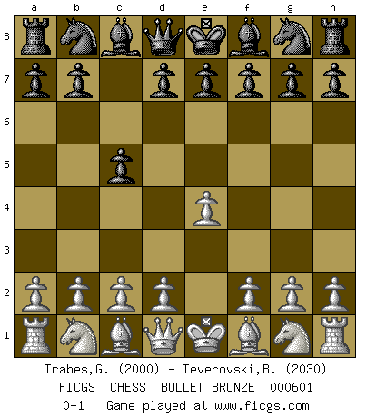 Last move : 0-1 2011 October 14 18:18:45 [Event "FICGS__CHESS__BULLET_BRONZE__000601"] [Site "FICGS"] [Date "2011.10.14"] [Round "1"] [White "Trabes,Guillermo"] [Black "Teverovski,Bogoljub"] [Result "0-1"] [WhiteElo "2000"] [BlackElo "2030"] 1.e4 c5 0-1 This chess game has been lost on time (started : 2011.10.14 18:10:40) Sicilian defense Player Black won this chess game. Follow this game move after move (download)Fischer sacrificed virtually everything most of us weakies (to use his term) value, respect, and cherish, for the sake of an artful, often beautiful board game, for the ambivalent privilege of being its greatest master. (Paul Kollar) Schach verlangt totale Konzentration. (Robert James Fischer) En un gambito tu regalas un Peón por el bién de tomar un juego perdido. (Samuel Standige Boden) Le jeu d'échecs fait naître et fortifie en nous plusieurs qualités précieuses dans le cours de l'existence, telles que la prévoyance, la circonspection, la prudence, et la persévérance. (Benjamin Franklin - 1783, la morale des échecs) Faith : not wanting to know what is true. (Friedrich Nietzsche)