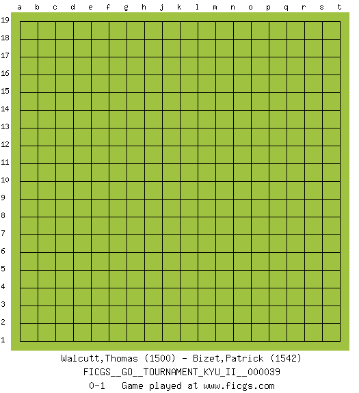 Last move : 0-1 2011 November 14 0:44:40 [Event "FICGS__GO__TOURNAMENT_KYU_II__000039"] [Site "FICGS"] [Date "2011.10.14"] [Round "1"] [Black "Walcutt,Thomas"] [White "Bizet,Patrick"] [Result "0-1"] [Rating 1 "1500"] [Rating 2 "1542"] 0-1 This go game has been lost on time (started : 2011.10.14 19:19:16) Here are the names of the openings (joseki) played in the four corners : Player White won this Go (weiqi, baduk) game. Follow this game move after move (download)Good moves and bad moves are bedfellows. (Anonymous) If only people were all showed a certain minimum level of niceness; if only people didn't retract verbal draw offers (without draw box ticked) on ficgs; if only people didn't kill; if only people didn't run concentration / extermination camps, if only people didn't drop nuclear bombs on Hiroshima and Nagasaki, and so on - it would be a much more beautiful world. But sadly, things are not so... (Normajean Yates)