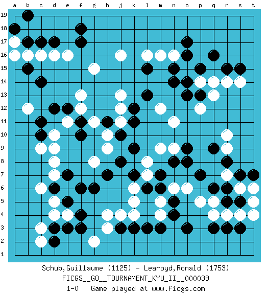 Last move : 1-0 2012 April 29 12:23:48 [Event "FICGS__GO__TOURNAMENT_KYU_II__000039"] [Site "FICGS"] [Date "2011.10.14"] [Round "1"] [Black "Schub,Guillaume"] [White "Learoyd,Ronald"] [Result "1-0"] [Rating 1 "1125"] [Rating 2 "1753"] 1.q16 d4 2.q3 d16 3.f3 c6 4.d2 c3 5.j3 d10 6.f17 j16 7.c17 c16 8.d17 e16 9.f18 g15 10.o17 r10 11.r5 r14 12.s15 s14 13.r15 p14 14.f10 d8 15.d12 e11 16.e12 f12 17.f11 f13 18.c10 c9 19.c11 d9 20.c14 b12 21.b15 b16 22.b17 a17 23.a18 a16 24.b19 r7 25.n4 h4 26.f4 e6 27.g6 j4 28.k3 k4 29.l3 k6 30.f6 h3 31.e7 d7 32.e5 d5 33.d6 c2 34.d3 e4 35.e3 n6 36.n14 o15 37.n15 n16 38.o16 m16 39.p13 q13 40.o13 m12 41.p15 q14 42.o14 p12 43.l15 l16 44.l13 g8 45.h7 g2 46.j8 h9 47.k9 j11 48.j10 h10 49.h11 g11 50.k11 j12 51.k12 j13 52.m6 m5 53.n5 m4 54.m3 o6 55.l6 k5 56.k7 l7 57.m7 l8 58.n8 m9 59.o9 n11 60.q9 r9 61.p7 p5 62.o3 n9 63.o8 q5 64.q6 r4 65.r6 q4 66.r3 s4 67.s3 t6 68.s7 s6 69.s5 t5 70.t7 t4 71.r8 1-0 This go game has been lost on time (started : 2011.10.14 19:19:16) Here are the names of the openings (joseki) played in the four corners : Corner d4 : d4 f3 Hoshi (Hwajeom, Seongjeom, Xingwei`) 4-4 Point. The star or hoshi (4-4) point, emphasizing influence at the potential expense of territory. Ikken Kakari (Hankan Keolch'im, Yi Gua`jiao~, 1-Space Low Approach). Black 2 is the standard approach move to the 4-4. Corner d16 : d16 f17 Hoshi (Hwajeom, Seongjeom, Xingwei`) 4-4 Point. The star or hoshi (4-4) point, emphasizing influence at the potential expense of territory. Ikken Kakari (Hankan Keolch'im, Yi Gua`jiao~, 1-Space Low Approach). Black 2 is the standard approach move to the 4-4. Player Black won this Go (weiqi, baduk) game. Follow this game move after move (download)The intersection is rarely neutral. (Pierre Audouard) Without deviation from the norm, progress is not possible. (Frank Zappa)