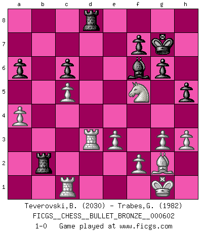 Last move : 1-0 2011 October 14 20:40:5 [Event "FICGS__CHESS__BULLET_BRONZE__000602"] [Site "FICGS"] [Date "2011.10.14"] [Round "1"] [White "Teverovski,Bogoljub"] [Black "Trabes,Guillermo"] [Result "1-0"] [WhiteElo "2030"] [BlackElo "1982"] 1.d4 Nf6 2.c4 g6 3.Nf3 Bg7 4.g3 O-O 5.Bg2 d6 6.O-O Nbd7 7.Qc2 e5 8.dxe5 dxe5 9.Nc3 c6 10.Rd1 Qe7 11.h3 Re8 12.Be3 Nc5 13.b4 Bf5 14.Qb2 Nce4 15.Nh4 Nxc3 16.Qxc3 Bd7 17.Nf3 Red8 18.Nd2 h5 19.Bg5 a6 20.a4 Qf8 21.Rab1 Be6 22.Qf3 e4 23.Qf4 Qd6 24.Qxd6 Rxd6 25.c5 R6d8 26.Bxf6 Bxf6 27.Nxe4 Kg7 28.Nd6 Rab8 29.Rd3 b6 30.Rc1 bxc5 31.bxc5 Rb2 32.e3 Bf5 33.Nxf5+ 1-0 This chess game has been lost on time (started : 2011.10.14 19:23:1) King's Indian, 3.Nf3 Kingside Castling by player Black (move 4) Kingside Castling by player White (move 6) Player White won this chess game. Follow this game move after move (download)I give 98 percent of my mental energy to Chess. Others give only 2 percent. (Bobby Fischer) Gegen einen Schachcomputer zu verlieren ist wie Löcher in den Strümpfen zuhaben. Es ist nicht peinlich, solange man der einzige ist der es weiß. (Anonymous) Bobby solo arroja las piezas y solas caen en las casillas correctas. (Miguel Najdorf ) Les erreurs sont comme les malheurs, elles n'arrivent jamais seules. (Siegbert Tarrasch) Treat your password like your toothbrush. Don't let anybody else use it, and get a new one every six months. (Clifford Stoll)
