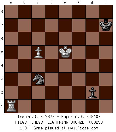 Last move : 1-0 2011 October 14 20:38:2 [Event "FICGS__CHESS__LIGHTNING_BRONZE__000239"] [Site "FICGS"] [Date "2011.10.14"] [Round "1"] [White "Trabes,Guillermo"] [Black "Ropokis,Dimitrios"] [Result "1-0"] [WhiteElo "1982"] [BlackElo "1810"] 1.e4 e5 2.Nf3 Nf6 3.d4 exd4 4.e5 Ne4 5.Qxd4 d5 6.exd6 Nxd6 7.Nc3 Nc6 8.Qf4 g6 9.Bd3 Bg7 10.Be3 O-O 11.O-O-O Be6 12.h4 Qf6 13.Qa4 h6 14.Rhe1 Rfe8 15.a3 Kh8 16.Bd2 Rad8 17.Qf4 Qxf4 18.Bxf4 Bxc3 19.bxc3 Kg7 20.Nd4 Nxd4 21.cxd4 a6 22.Kb2 b5 23.Kc3 Rd7 24.Rd2 Nc8 25.Bxb5 axb5 26.d5 Rde7 27.dxe6 Rxe6 28.Rxe6 Rxe6 29.Rd5 c6 30.Re5 Rf6 31.Be3 Nd6 32.Bd4 Kg8 33.g3 Rf3+ 34.Kb4 Kh7 35.Re2 g5 36.hxg5 hxg5 37.Kc5 Nc4 38.a4 Rf5+ 39.Kb4 Rd5 40.Bc5 Nb2 41.a5 Na4 42.a6 Rxc5 43.a7 Rc4+ 44.Ka5 Nc3 45.Re1 Ra4+ 46.Kb6 f5 47.Re8 Ne4 48.a8Q Rxa8 49.Rxa8 c5 50.f3 Nxg3 51.Kxb5 Nh5 52.c4 g4 53.fxg4 fxg4 54.Kxc5 g3 55.Kd6 Nf6 56.c5 Ne4+ 57.Kd5 Nc3+ 58.Ke5 g2 59.Ra1 1-0 Petrov : Modern attack, Main line Kingside Castling by player Black (move 10) Queenside Castling by player White (move 11) Promotion Queen by player White (move 48) 10 pieces endgame at move 50 : White KRPP , Black KNPPPP WHITE : King + 1 Rook 2 Pawns BLACK : King + 1 Knight 4 Pawns 9 pieces endgame at move 51 : White KRPP , Black KNPPP WHITE : King + 1 Rook 2 Pawns BLACK : King + 1 Knight 3 Pawns 8 pieces endgame at move 53 : White KRPP , Black KNPP WHITE : King + 1 Rook 2 Pawns BLACK : King + 1 Knight 2 Pawns 7 pieces endgame at move 53 : White KRP , Black KNPP WHITE : King + 1 Rook 1 Pawn BLACK : King + 1 Knight 2 Pawns 6 pieces endgame at move 54 : White KRP , Black KNP WHITE : King + 1 Rook 1 Pawn BLACK : King + 1 Knight 1 Pawn Player White won this chess game. Follow this game move after move (download)Not only will I predict his triumph over Botvinnik, but I'll go further and say that he'll probably be the greatest Chess player that ever lived. (John Collins) Es genügt nicht ein guter Spieler zu sein, man muß auch gut spielen. (Siegbert Tarrasch) El Ajedrez tiene tanto misterio como las mujeres. (Purdy) Même si vous avez un bon coup à faire, regardez toujours s'il n'y en a pas un qui lui soit préférable. (Pedro Damiano) The best teachers teach from the heart, not from the book. (Author unknown)