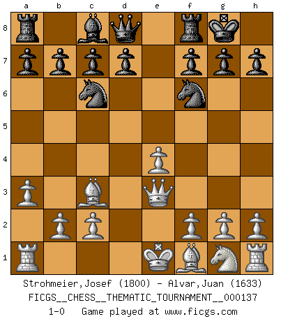 Last move : 1-0 2011 November 27 2:13:33 [Event "FICGS__CHESS__THEMATIC_TOURNAMENT__000137"] [Site "FICGS"] [Date "2011.10.15"] [Round "1"] [White "Strohmeier,Josef"] [Black "Alvar,Juan"] [Result "1-0"] [WhiteElo "1800"] [BlackElo "1633"] 1.e4 e5 2.d4 exd4 3.Qxd4 Nc6 4.Qe3 Nf6 5.Nc3 Bb4 6.Bd2 O-O 7.a3 Bxc3 8.Bxc3 1-0 This chess game has been lost on time (started : 2011.10.15 9:47:56) Centre game : Berger variation Kingside Castling by player Black (move 6) Player White won this chess game. Follow this game move after move (download)Capture of the adverse King is the ultimate but not the first object of the game. (William Steinitz) Karpov ist ein Museumsstück. (Garry Kasparov) Solo el jugador con la iniciativa tiene el derecho a atacar. (Wilhelm Steinitz) Nous vivons dans un monde échiquéen : chaque jour qui passe est un défi à relever. (Philosophe Sasha) When you have everything, sometimes it feels like nothing. (Horatio Caine, C.S.I. Miami)