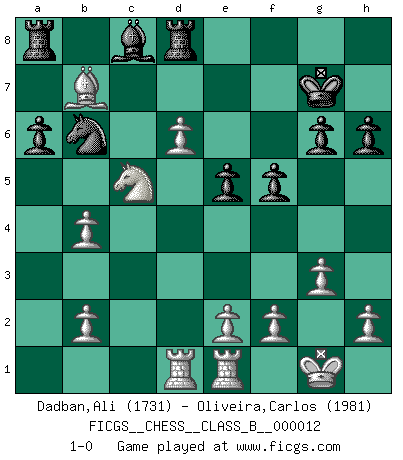 Last move : 1-0 2007 February 5 2:13:16 [Event "FICGS__CHESS__CLASS_B__000012"] [Site "FICGS"] [Date "2007.01.04"] [Round "1"] [White "Dadban,Ali"] [Black "Oliveira,Carlos"] [Result "1-0"] [WhiteElo "1731"] [BlackElo "1981"] 1.Nf3 Nf6 2.c4 c5 3.g3 Nc6 4.Bg2 g6 5.O-O Bg7 6.Nc3 O-O 7.d4 cxd4 8.Nxd4 a6 9.Re1 e5 10.Nb3 d6 11.Bg5 h6 12.Bxf6 Bxf6 13.Ne4 Be7 14.Qd2 Kg7 15.Rad1 d5 16.cxd5 Bb4 17.Nc3 Nb8 18.a3 Bd6 19.Ne4 f5 20.Nxd6 Qxd6 21.Qb4 Qxb4 22.axb4 Nd7 23.Nc5 Nb6 24.d6 Rd8 25.Bxb7 1-0 Reti Opening Kingside Castling by player White (move 5) Kingside Castling by player Black (move 6) Player White won this chess game. Follow this game move after move (download)Castle early and often. (Rob Sillars) Früher wurde jeder komplizierte Zug, jedes interessante Opfer mit großem Beifall und Enthusiasmus aufgenommen. Heute schaltet man einfach seinen Fritz an, und man kann sehen, was los ist, ob der Zug geht oder nicht. (Vladimir Kramnik) El muchacho (en ese entonces un niño de 12 años llamado Anatoly Karpov) no tiene ni idea de lo que es el Ajedrez y no hay futuro en absoluto para el en esta profesión. (Mikhail Botvinnik) Les Echecs sont affaire de jugement sensible. Savoir quand frapper et quand esquiver. (Fischer) CHESS, n. f. [echecs, Fr.] A nice and abstruse game, in which two sets of puppets are moved in opposition to each other. (Dr Samuel Johnson, A Dictionary Of The English Language, 1755)