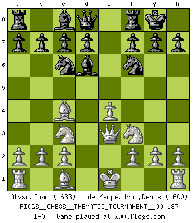 Last move : 1-0 2011 December 14 4:25:35 [Event "FICGS__CHESS__THEMATIC_TOURNAMENT__000137"] [Site "FICGS"] [Date "2011.10.15"] [Round "1"] [White "Alvar,Juan"] [Black "de Kerpezdron,Denis"] [Result "1-0"] [WhiteElo "1633"] [BlackElo "1600"] 1.e4 e5 2.d4 exd4 3.Qxd4 Nc6 4.Qe3 Nf6 5.Nc3 Bd6 6.Bc4 O-O 7.Nf3 1-0 This chess game has been lost on time (started : 2011.10.15 9:47:56) Centre game : Berger variation Kingside Castling by player Black (move 6) Player White won this chess game. Follow this game move after move (download)Don't even mention losing to me. I can't stand to think of it. (Bobby Fischer) Ich glaube, ich kenne inzwischen die Gründe für mein Versagen: schachliche Charakterfehler. Ich war nie ein Wunderkind und in meiner gesamten menschlichen Entwicklung immer zu langsam. (Viktor Kortschnoi) Si el ingenio solamente fuese necesario para lucirse, las mujeres serían las mejores jugadoras de Ajedrez del mundo. (Albin) Le profane ne songe pas à la somme de jouissance dont il se prive, qui méconnaît ce jeu aux ressources aussi variées que passionnantes. (Jean-Marie Jeanton-Lamarche) Being number two sucks. (Andre Agassi)