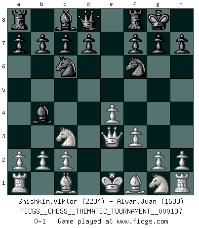 Last move : 0-1 2011 December 15 4:26:40 [Event "FICGS__CHESS__THEMATIC_TOURNAMENT__000137"] [Site "FICGS"] [Date "2011.10.15"] [Round "1"] [White "Shishkin,Viktor"] [Black "Alvar,Juan"] [Result "0-1"] [WhiteElo "2234"] [BlackElo "1633"] 1.e4 e5 2.d4 exd4 3.Qxd4 Nc6 4.Qe3 Nf6 5.Nc3 Bb4 6.f3 O-O 0-1 This chess game has been lost on time (started : 2011.10.15 9:47:56) Centre game : Berger variation Kingside Castling by player Black (move 6) Player Black won this chess game. Follow this game move after move (download)In Chess, just as in life, today's bliss may be tomorrow's poison. (Assaic) Wie gewinnt Tal? Er entwickelt alle seine Figuren in die Brettmitte und opfert sie dann irgendwo. (Robert James Fischer) Tu sabes que vas a perder. Aún cuando tenía la ventaja, yo sabía que iba a perder. - al estar jugando con Fischer (Andrew Soltis) Les Echecs ont trois composantes : le temps, l'espace et le matériel en dernier. (Mikhail Tal) There are two kinds of tragedy in this world, one is not getting what you want and the other is getting. (Lord of war)