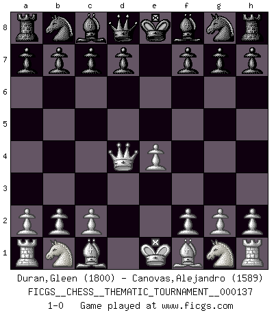 Last move : 1-0 2011 November 24 13:38:57 [Event "FICGS__CHESS__THEMATIC_TOURNAMENT__000137"] [Site "FICGS"] [Date "2011.10.15"] [Round "1"] [White "Duran,Gleen"] [Black "Canovas,Alejandro"] [Result "1-0"] [WhiteElo "1800"] [BlackElo "1589"] 1.e4 e5 2.d4 exd4 3.Qxd4 1-0 This chess game has been lost on time (started : 2011.10.15 9:47:56) Centre game Player White won this chess game. Follow this game move after move (download)In Fischer's hands, a slight theoretical advantage is as good a being a Queen ahead. (Isaac Kashdan) Kasparov stellt für gewöhnlich die Regeln auf und bricht sie dann selbst wieder. (Alexej Shirov) Los errores estan ahí, esperando a que se cometan. (Savielly Tartakower) Le temps de noter son nom sur la feuille de partie, j'étais déjà en zeitnot ! D'un modeste amateur apparié lors de la première ronde d'un open contre le grand-maître Azmaïparashvili. The question of whether computers can think is just like question of whether submarines can swim. (Edsger W. Dijkstra)
