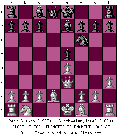 Last move : 0-1 2011 December 13 16:18:37 [Event "FICGS__CHESS__THEMATIC_TOURNAMENT__000137"] [Site "FICGS"] [Date "2011.10.15"] [Round "1"] [White "Pech,Stepan"] [Black "Strohmeier,Josef"] [Result "0-1"] [WhiteElo "1939"] [BlackElo "1800"] 1.e4 e5 2.d4 exd4 3.Qxd4 Nc6 4.Qe3 Nf6 5.Bd2 d6 6.Nf3 Ne5 7.h3 Be7 8.Nxe5 dxe5 0-1 This chess game has been lost on time (started : 2011.10.15 9:47:56) Centre game : Berger variation Player Black won this chess game. Follow this game move after move (download)The way he plays Chess demonstrates a man's whole nature. (Stanley Ellin) Wenn du gegen Bobby spielst, ist es keine Frage von gewinnen oder verlieren. Es ist eine Frage des Überlebens. (Boris Vassilievich Spassky) Morphy probablemente fue el genio más grande de todos. (Bobby Fischer) Vous savez, camarade Pachman, je n'éprouve pas de plaisir à être ministre, je jouerais plutôt aux échecs comme vous, ou alors ferais une révolution au Venezuela. (Che Guevara à Ludek Pachman, 'Checkmate in Prague', 1975) Art is the only way to run away without leaving home. (Twyla Tharp)