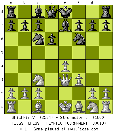 Last move : 0-1 2011 November 27 2:13:33 [Event "FICGS__CHESS__THEMATIC_TOURNAMENT__000137"] [Site "FICGS"] [Date "2011.10.15"] [Round "1"] [White "Shishkin,Viktor"] [Black "Strohmeier,Josef"] [Result "0-1"] [WhiteElo "2234"] [BlackElo "1800"] 1.e4 e5 2.d4 exd4 3.Qxd4 Nc6 4.Qe3 Nf6 5.Nc3 d6 6.f3 Be7 0-1 This chess game has been lost on time (started : 2011.10.15 9:47:56) Centre game : Berger variation Player Black won this chess game. Follow this game move after move (download)Robert Fischer is a law unto himself. (Larry Evans) Glücklicherweise sind Großmeister Ruben Fines reine Schachbücher weniger phallozentrisch [als seine Schachpsychologie] und deswegen auch weniger lächerlich. (Nigel Short) Una mala movida nulifica cuarenta buenas. (Horowitz) La victoire dans une partie d'Echecs appartient la plupart du temps à celui qui voit un peu plus loin que l'adversaire. (Lasker) Logic : The art of thinking and reasoning in strict accordance with the limitations and incapacities of the human misunderstanding. (Ambrose Bierce)
