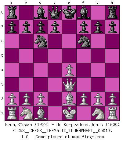 Last move : 1-0 2011 December 26 17:20:7 [Event "FICGS__CHESS__THEMATIC_TOURNAMENT__000137"] [Site "FICGS"] [Date "2011.10.15"] [Round "1"] [White "Pech,Stepan"] [Black "de Kerpezdron,Denis"] [Result "1-0"] [WhiteElo "1939"] [BlackElo "1600"] 1.e4 e5 2.d4 exd4 3.Qxd4 Nc6 4.Qe3 Nf6 5.Be2 1-0 This chess game has been lost on time (started : 2011.10.15 9:47:56) Centre game : Berger variation Player White won this chess game. Follow this game move after move (download)When the Chess game is over, the Pawn and the King go back to the same box. (Irish saying) Früher wurde jeder komplizierte Zug, jedes interessante Opfer mit großem Beifall und Enthusiasmus aufgenommen. Heute schaltet man einfach seinen Fritz an, und man kann sehen, was los ist, ob der Zug geht oder nicht. (Vladimir Kramnik) El Ajedrez es despiadado: debes de estar preparado para matar gente. (Nigel Short) Mais n'est-ce pas déjà le limiter injurieusement que d'appeler les échecs un jeu? N'est-ce pas aussi une science, un art, ou quelque chose qui, comme le cercueil de Mahomet entre ciel et terre, est suspendu entre l'un et l'autre, et qui réunit un nombre incroyable de contraires ? (Stefan Zweig) But they are useless. They can only give you answers. (Pablo Picasso, about computers)