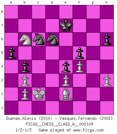 Last move : 1/2-1/2 2012 August 4 15:4:55 [Event "FICGS__CHESS__CLASS_A__000109"] [Site "FICGS"] [Date "2011.10.15"] [Round "1"] [White "Duenas,Alexis"] [Black "Vasquez,Fernando"] [Result "1/2-1/2"] [WhiteElo "2010"] [BlackElo "2002"] 1.d4 d5 2.c4 dxc4 3.Nf3 a6 4.e3 e6 5.Bxc4 c5 6.O-O Nf6 7.dxc5 Bxc5 8.Qxd8+ Kxd8 9.Nbd2 Ke7 10.Be2 Bd7 11.Nb3 Bb6 12.Bd2 Nc6 13.Bd3 Rhd8 14.Rac1 e5 15.Bb1 Be6 16.Bc3 Bxb3 17.axb3 Bc7 18.Rfd1 h6 19.h3 Rxd1+ 20.Rxd1 Rd8 21.Rxd8 Kxd8 22.Kf1 Ke7 23.Ke2 b5 24.Bf5 Bd6 25.Bc8 b4 26.Be1 a5 27.Nd2 Nd7 28.Bb7 Nd8 29.Be4 Nc5 30.Bc2 Ke6 31.f3 f5 32.Bh4 Nc6 33.g4 g6 34.Bg3 Bf8 35.Nc4 Bg7 36.Bh4 e4 37.f4 Bh8 38.Ke1 Bf6 39.gxf5+ gxf5 40.Bxf6 Kxf6 41.Kd2 Ke6 42.Bd1 Ke7 43.Kc2 Nd7 44.Bh5 Nf6 45.Be2 Ne8 46.Nb6 Nd6 1/2-1/2 QGA : Alekhine defense Kingside Castling by player White (move 6) This chess game ended in a draw. Follow this game move after move (download)Discovered check is the dive bomber of the Chessboard. (Reuben Fine) Nie in meinem Leben habe ich die französische Verteidigung gespielt, welche die Stumpfsinnigste von allen ist. (Wilhelm Steinitz) El Ajedrez es un juego terrible. Si no dominas el centro, tu oponente tiene una posición mas libre. Si tu tienes el centro, entonces realmente tienes algo de que preocuparte. (Siegbert Tarrasch) Les Echecs ont trois composantes : le temps, l'espace et le matériel en dernier. (Mikhail Tal) Have no fear of perfection - you'll never reach it. (Salvador Dali)