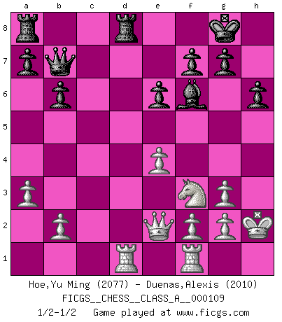 Last move : 1/2-1/2 2011 December 24 14:54:18 [Event "FICGS__CHESS__CLASS_A__000109"] [Site "FICGS"] [Date "2011.10.15"] [Round "1"] [White "Hoe,Yu Ming"] [Black "Duenas,Alexis"] [Result "1/2-1/2"] [WhiteElo "2077"] [BlackElo "2010"] 1.Nf3 d5 2.d4 Nf6 3.c4 e6 4.Bg5 Be7 5.Nc3 h6 6.Bh4 O-O 7.e3 b6 8.Bd3 Bb7 9.O-O Nbd7 10.Bg3 c5 11.Qe2 Ne4 12.Rad1 Nxg3 13.hxg3 cxd4 14.Nxd4 Nf6 15.Nf3 Qb8 16.cxd5 Nxd5 17.Nxd5 Bxd5 18.Ba6 Bf6 19.e4 Bb7 20.Bxb7 Qxb7 21.Kh2 Rfd8 22.a3 1/2-1/2 Reti Opening Kingside Castling by player Black (move 6) Kingside Castling by player White (move 9) This chess game ended in a draw. Follow this game move after move (download)In blitz, the Knight is stronger than the Bishop. (Vlastimil Hort) Ich glaube nicht an Psychologie, ich glaube an gute Züge. (Robert James Fischer) Por esta medida (el intervalo entre Fischer y sus contemporaneos), yo le considero el mas grande campeón mundial. (Garry Kasparov) Le système Elo représente seulement une moyenne. Il est simplement un indicateur de votre stabilité. (Anatoli Karpov) The quality of decision is like the well-timed swoop of a falcon which enables it to strike and destroy its victim. (Sun Tzu)