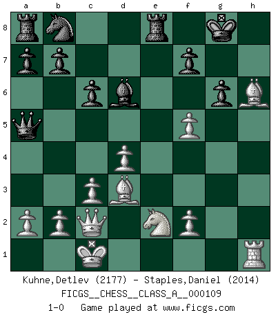 Last move : 1-0 2012 February 5 18:32:4 [Event "FICGS__CHESS__CLASS_A__000109"] [Site "FICGS"] [Date "2011.10.15"] [Round "1"] [White "Kuhne,Detlev"] [Black "Staples,Daniel"] [Result "1-0"] [WhiteElo "2177"] [BlackElo "2014"] 1.e4 c6 2.d4 d5 3.Nc3 dxe4 4.Nxe4 Nf6 5.Nxf6+ exf6 6.c3 Bd6 7.Bd3 O-O 8.Ne2 Qc7 9.Qc2 g6 10.h4 f5 11.h5 Be6 12.Bh6 Re8 13.hxg6 hxg6 14.g4 Bd5 15.O-O-O Bxh1 16.Rxh1 Qa5 17.gxf5 1-0 This chess game has been lost on time (started : 2011.10.15 15:32:52) Caro-Kann : Tartakower (Nimzovich) variation Kingside Castling by player Black (move 7) Queenside Castling by player White (move 15) Player White won this chess game. Follow this game move after move (download)We don't really know how the game was invented, though there are suspicions. As soon as we discover the culprits, we'll let you know. (Bruce Pandolfini) Die Jungen erwarten, dass Opa einfach umfällt. Dann aber kann Opa fünf Stunden lang Schach spielen und die jungen Gegner an die Wand drücken. (Viktor Kortschnoi) Yo adoro todas la posiciones. Denme una partida posicional difícil, y la jugaré. Pero posiciones totalmente ganadas, no las tolero. (Hein Donner) Il vaut toujours mieux jouer un plan faux de façon logique que de n'avoir pas de plan du tout. (Victor Kortchnoï) The absolute truth is the thing that makes people laugh. (Carl Reiner)
