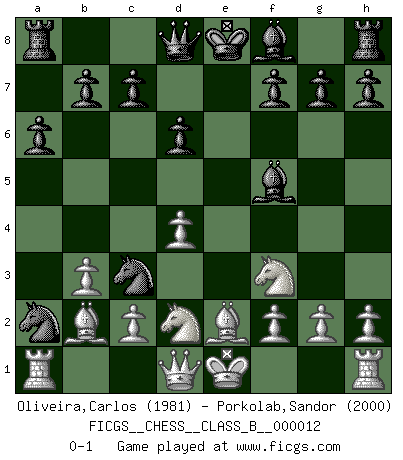Last move : 0-1 2007 February 5 2:28:30 [Event "FICGS__CHESS__CLASS_B__000012"] [Site "FICGS"] [Date "2007.01.04"] [Round "1"] [White "Oliveira,Carlos"] [Black "Porkolab,Sandor"] [Result "0-1"] [WhiteElo "1981"] [BlackElo "2000"] 1.b3 e5 2.Bb2 Nc6 3.e3 d6 4.Bb5 Nge7 5.d4 a6 6.Be2 Bf5 7.Nd2 exd4 8.exd4 Nb4 9.Rc1 Nxa2 10.Ra1 Nb4 11.Rc1 Ned5 12.Ngf3 Na2 13.Ra1 Ndc3 0-1 Nimzovich-Larsen attack : Modern variation Player Black won this chess game. Follow this game move after move (download)There are two classes of men; those who are content to yield to circumstances and who play whist; those who aim to control circumstances, and who play Chess. (Mortimer Collins) Woher wissen wir, daß der Neanderthaler Blindschach gespielt hat? -- Bei Ausgrabungen wurden keine Schachbretter und Figuren gefunden. (Anonymous) Una buena ofensiva y una buena defensa, comienzan ambas con un buen desarrollo. (Bruce A. Moon) Le génie consiste à savoir transgresser les règles au moment opportun. (Teichmann) True nature is revealed in times of difficulty. (Chinese proverb)