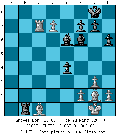 Last move : 1/2-1/2 2012 January 4 12:47:43 [Event "FICGS__CHESS__CLASS_A__000109"] [Site "FICGS"] [Date "2011.10.15"] [Round "1"] [White "Groves,Don"] [Black "Hoe,Yu Ming"] [Result "1/2-1/2"] [WhiteElo "2078"] [BlackElo "2077"] 1.e4 c5 2.Nf3 d6 3.d4 cxd4 4.Nxd4 Nf6 5.Nc3 a6 6.Be2 e5 7.Nb3 Be7 8.Qd3 O-O 9.O-O Be6 10.Be3 Nc6 11.a3 Na5 12.Nd5 Nxb3 13.Qxb3 Nxd5 14.exd5 Bf5 15.Qxb7 a5 16.b4 axb4 17.axb4 Rb8 18.Qc6 Rxb4 19.Rfb1 Qb8 20.Rxb4 Qxb4 21.Ra7 Qb1+ 22.Bf1 Bf6 23.Qxd6 Bxc2 24.Qa3 h6 25.d6 e4 26.Qc1 Rb8 27.Rc7 Qxc1 28.Bxc1 Bb3 29.d7 Be6 30.g3 Rb1 31.Bg2 1/2-1/2 Sicilian : Najdorf, Opovcensky variation Kingside Castling by player Black (move 8) Kingside Castling by player White (move 9) This chess game ended in a draw. Follow this game move after move (download)For surely of all the drugs in the world, Chess must be the most permanently pleasurable. (Assiac) Die westlichen Werte sind eine Sprache, welche die Putin-Administration nicht versteht. (Garry Kasparov) El Ajedrez se juega con la mente... ¡no con las manos!. (Renaud y Kahn) Les erreurs sont comme les malheurs, elles n'arrivent jamais seules. (Siegbert Tarrasch) I don't diet. I just don't eat as much as I'd like to. (Linda Evangelista, supermodel)