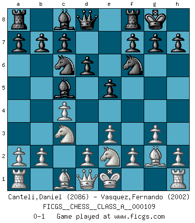 Last move : 0-1 2011 November 30 14:36:6 [Event "FICGS__CHESS__CLASS_A__000109"] [Site "FICGS"] [Date "2011.10.15"] [Round "1"] [White "Canteli,Daniel"] [Black "Vasquez,Fernando"] [Result "0-1"] [WhiteElo "2086"] [BlackElo "2002"] 1.c4 e5 2.g3 Nc6 3.Bg2 Nf6 4.Nc3 Bc5 5.e3 d6 6.Nge2 O-O 0-1 This chess game has been lost on time (started : 2011.10.15 15:32:52) English Opening Kingside Castling by player Black (move 6) Player Black won this chess game. Follow this game move after move (download)I won't play with you anymore. You have insulted my friend. - When an opponent cursed himself for a blunder. (Miguel Najdorf) Warum muß ich gegen diesen IDIOTEN verlieren? (Aaron Nimzowitsch) Dejen al perfeccionista jugar por correo. (Yasser Seirawan) Vous m'avez demandé de vous exposer quel est le fondement de la prière. Je ne fais que préparer les pièces du jeu sur la table... Nous sera-t-il permis d'en adopter les règles et si nous les appliquons scrupuleusement nous ne tarderons pas à faire mat le Roi divin ! Il ne pourra échapper à nos mains. (Sainte Thérèse d'Avila, Chemin de perfection) The obstacle is the path. (Zen proverb)