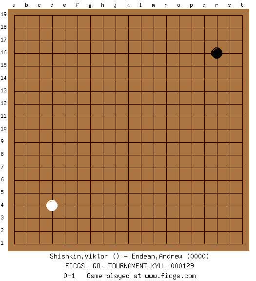 Last move : 0-1 2011 November 16 0:51:25 [Event "FICGS__GO__TOURNAMENT_KYU__000129"] [Site "FICGS"] [Date "2011.10.15"] [Round "1"] [Black "Shishkin,Viktor"] [White "Endean,Andrew"] [Result "0-1"] [Rating 2 "0000"] 1.r16 d4 0-1 This go game has been lost on time (started : 2011.10.15 18:2:9) Here are the names of the openings (joseki) played in the four corners : Corner d4 : d4 0-1 Hoshi (Hwajeom, Seongjeom, Xingwei`) 4-4 Point. The star or hoshi (4-4) point, emphasizing influence at the potential expense of territory. Player White won this Go (weiqi, baduk) game. Follow this game move after move (download)Sacrifice for shape. (Anonymous) Everything in life is luck. (Donald Trump)