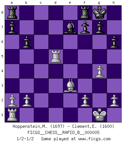 Last move : 1/2-1/2 2006 July 6 1:30:28 [Event "FICGS__CHESS__RAPID_B__000005"] [Site "FICGS"] [Date "2006.05.10"] [Round "1"] [White "Hoppenstein,Michael"] [Black "Clement,Etienne"] [Result "1/2-1/2"] [WhiteElo "1697"] [BlackElo "1600"] 1.d4 Nf6 2.Nf3 d5 3.e3 c5 4.Nbd2 e6 5.c4 Nc6 6.Bd3 dxc4 7.Nxc4 cxd4 8.O-O Be7 9.exd4 Nxd4 10.Nxd4 Qxd4 11.Be3 Qd5 12.Qc2 Bd7 13.Be2 Qc6 14.Qd2 O-O 15.Ne5 Qd5 16.Nxd7 Nxd7 17.Qxd5 exd5 18.Bf3 Nf6 19.Rfd1 b6 20.g4 h6 21.Bxd5 Nxd5 22.Rxd5 1/2-1/2 Queen's pawn game Kingside Castling by player White (move 8) Kingside Castling by player Black (move 14) This chess game ended in a draw. Follow this game move after move (download)Nothing excites jaded Grandmasters more than a theoretical novelty. (Dominic Lawson) Versuche, dich von der Sklaverei der Eröffnungsvarianten zu befreien. Stattdessen soll man gewisse Typenpositionen erlernen, die man eingehend analysiert. (Aaron Nimzowitsch) Los Peones son el alma de una partida de Ajedrez. (Francois Andre Danican Philidor) Avant la finale, les dieux ont créé le milieu de partie. (Tarrasch) Luck has a peculiar habit of favoring those who don't depend on it. (Author unknown)