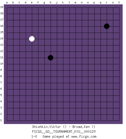 Last move : 1-0 2011 November 16 0:47:30 [Event "FICGS__GO__TOURNAMENT_KYU__000129"] [Site "FICGS"] [Date "2011.10.15"] [Round "1"] [Black "Shishkin,Viktor"] [White "Broad,Ken"] [Result "1-0"] 1.r16 e14 2.h11 1-0 Here are the names of the openings (joseki) played in the four corners : Corner d16 : e14 h11 This joseki is unknown. A weak or weird move has probably been played in this corner. Player Black won this Go (weiqi, baduk) game. Follow this game move after move (download)One point in the center is worth ten in the corner. (Anonymous) Real knowledge is to know the extent of one's ignorance. (Confucius)