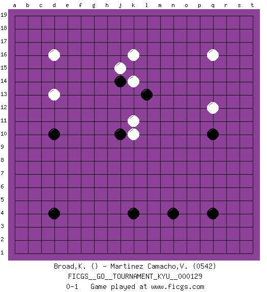 Last move : 0-1 2011 October 22 0:57:49 [Event "FICGS__GO__TOURNAMENT_KYU__000129"] [Site "FICGS"] [Date "2011.10.15"] [Round "1"] [Black "Broad,Ken"] [White "Martinez Camacho,Victor Hugo"] [Result "0-1"] [Rating 2 "0542"] 1.j10 q16 2.q10 d16 3.d10 q12 4.j14 k16 5.q4 d13 6.d4 k14 7.k4 k11 8.n4 k10 9.l13 j15 0-1 Here are the names of the openings (joseki) played in the four corners : Corner d16 : d16 j14 Hoshi (Hwajeom, Seongjeom, Xingwei`) 4-4 Point. The star or hoshi (4-4) point, emphasizing influence at the potential expense of territory. Player White won this Go (weiqi, baduk) game. Follow this game move after move (download)I really believe that Go is destined to take the place of Chess as the leading intellectual game of the Occident, just as it has reigned supreme in the Orient for some four thousand years. (Edward Lasker, international chess master) We need strong personalities and only one world champion to attract sponsors. (Anatoly Karpov)